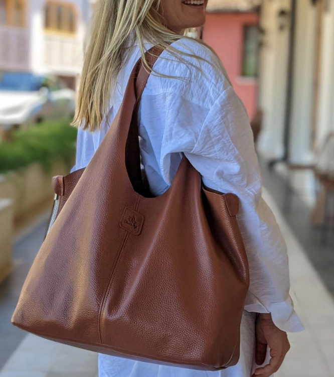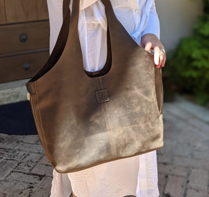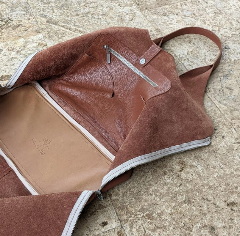 The Chocolate and Midnight are made from a smooth leather. This leather is naturally thicker, giving the reinforced bottom more structure. This version nods casual luxury and develops its own character, as the leather has natural variegation and ages like a fine wine. A definite head-turner!